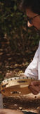 Imitar o movimento do realejo e levar queijo à boca; Imitar movimento do violão e levar pão à boca